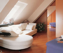 閣樓雖然看似復(fù)雜難用,卻有它與生俱來的優(yōu)點(diǎn)。閣樓空間豐富,富有趣味和變化;閣樓平均層高低,因此更使人感覺親切、溫暖,富有安全感;閣樓是神秘的,天然的斜面使室內(nèi)的光影變幻萬千;閣樓是最高的,有最開闊的視野、最新鮮的空氣;閣樓也是最貼近藍(lán)天的,躺在出自大師Antonio Citterio之手的白色沙發(fā)上,透過屋面的斜窗,感受一下“日看白云夜看星”的生活吧!也許我們還可以想得更遠(yuǎn)一些,想到童話中閣樓里的精靈,想到閣樓里的公主終于見到了白馬王子,想到巴黎圣母院閣樓里的愛情故事……為什么它們總是發(fā)生在閣樓里?因?yàn)殚w樓意味著溫暖和浪漫。