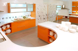 視覺(jué)效果是否整潔、輕松是夏季廚房設(shè)計(jì)的關(guān)鍵。橙色地柜、白色的臺(tái)面巧妙搭配,顯得清新飄逸,令人心曠神怡。U型臺(tái)面設(shè)計(jì)獨(dú)特時(shí)尚,更增加了操作空間。