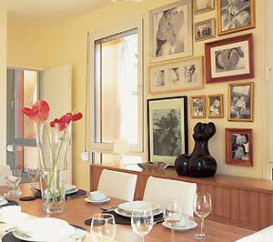 兒時的黑白照、過去的老城墻等等都會成為我們永恒的主題。用黑白照片布置居室,成本相對來說要便宜得多,內(nèi)容也十分廣泛,只要你認(rèn)為有意義的東西都可入照,而且制作也相對簡單。如果你手頭還保留著祖輩時代的照片,不妨將它們重新印放,布置在客廳或書房的墻上,可表現(xiàn)懷舊的情調(diào),但要注意單張照片不能放得太大,否則有壓抑感;也不要幾張照片放在一個畫框里,最好一張畫框中放一張照片,組合成一個畫面,也不宜掛在主墻上太一目了然的地方。