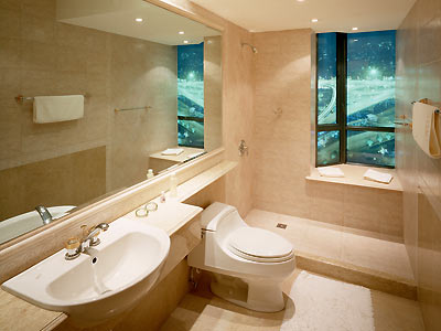 浴室中最理想的色調(diào)是粉色系。例如:粉紅、淡綠、淡藍及桃紅色等。其次則是奶油色系,或是一些中性色。如:黑色及白色,裝飾物及毛巾等配件則可選擇強烈的對比色系。