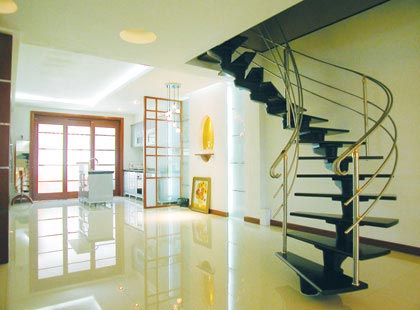 二層房子的樓梯是阻礙視覺的最大障礙,李先生的家尤其嚴重:原來的樓梯貼墻而設(shè),是磚石結(jié)構(gòu),雖然使用無憂,但看起來很是沉悶,于是設(shè)計師將原來的樓梯全部拆除,改用這種旋轉(zhuǎn)板式鏤空樓梯,這樣一改空間立馬靈動了起來。而設(shè)計師在這部分空間天棚上設(shè)計的圓形燈槽更是起到了活化空間、錦上添花的作用。不僅如此,還很好地劃分空間。