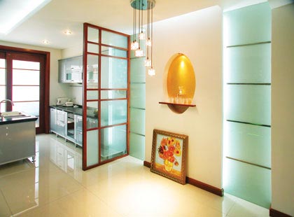 如果說開放式廚房已然尋常,透明衛(wèi)生間也不少見,可透明的書房卻很少在大戶型里見到。設(shè)計師并沒有像處理小戶型空間不足問題那樣將書房直接設(shè)在客廳里,擺個書架了事,而是保證書房原有位置不變,只是將其墻體打開做成了玻璃的,這樣做不僅保留了原有的功能區(qū),還使整體空間的通透性得到了貫徹。另一個值得借鑒的設(shè)計,是在書房的玻璃墻與廚房相對的位置上用木板隔出了一塊區(qū)域,這樣不僅冰箱有地方放了,整個玻璃墻還不顯得單調(diào)。