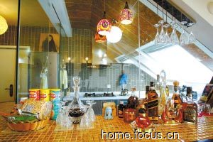 天窗的光線通過(guò)玻璃墻壁透進(jìn)門廳,門廳頓時(shí)“豁然開(kāi)朗”,一掃壓抑感。同時(shí),吧臺(tái)也是與廚房忙碌的家人互動(dòng)的最好空間。