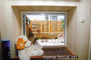 次臥窗外的小露臺(tái)地面鋪上黑白色鵝卵石,擺上兩只藤制椅子和小茶幾,在高大植物襯托下顯得悠閑自在。