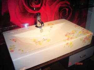 聘請高級美術(shù)師在坯體上進(jìn)行手繪圖案,然后送入窯爐一次性高溫?zé)?。潔具上面的圖案不僅具有較強(qiáng)的藝術(shù)性,而且由于色彩和坯體完全融為一體,具備了陶瓷性能,圖案耐磨,哪怕埋入地下經(jīng)千百年腐化,依然保持其鮮亮的色彩,這就保證了產(chǎn)品技術(shù)等方面的創(chuàng)新性和惟一性。