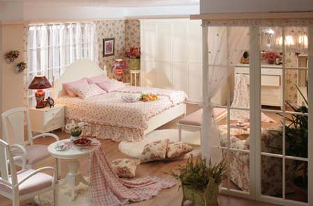 大量使用清新淡雅的顏色、柔美嬌嫩的花朵圖案,是使居室顯得更為浪漫的常用方法,這樣的床上用品多年來(lái)一直也是人們家居布置的首選參考方案。