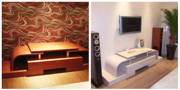 上面兩幅圖一個(gè)艷麗,一個(gè)淡雅。如果單就裝修而言,左圖頗具心思,一款抽象的線形花紋背景墻與電視柜以及地板很好的呼應(yīng)起來,顏色和諧統(tǒng)一,溫暖中透出溫馨;右圖相對(duì)簡(jiǎn)單,素白墻壁搭配淺色系電視柜,近乎平凡,然而,通過音響、盆栽、液晶電視以及一框相片的點(diǎn)綴,看似簡(jiǎn)簡(jiǎn)單單,卻勾勒出“簡(jiǎn)約”家的味道,簡(jiǎn)單裝飾搭配出了精巧的效果。 有道是:“好裝修不如好裝飾”——第一觀點(diǎn):有勝于無。
