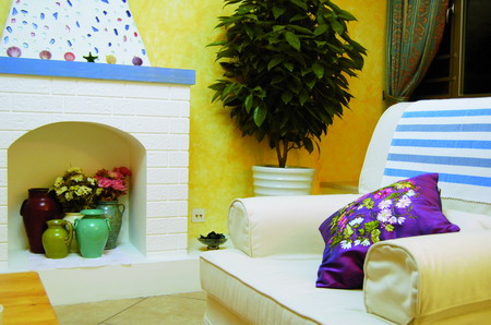 ●空間亮點(diǎn)二:圓拱帶出海洋味。不管是書房的開放入口,還是墻上的裝飾閣,整體都是圓拱的形狀。這是地中海風(fēng)格的典型特征之一。制作過程比較麻煩,先要用木板支模,然后用紅磚砌出拱門,最后用水泥抹面,盡量把線條抹圓潤一些;然后刷上白色就可以了。