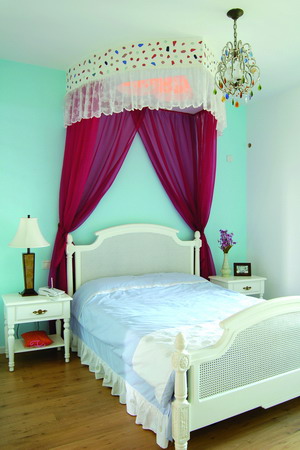 ●空間亮點(diǎn):Lulu自己住的臥室被她裝扮得像一個(gè)小公主的睡房。淡淡的藍(lán)色背景墻下,一顆紅色的心天天俯望著夢(mèng)里的小女孩,旁邊,還有輕紗圍繞。這樣的設(shè)計(jì)讓很多閨中密友羨慕、贊嘆,可也有人說它和整體的愛琴海風(fēng)格不搭配,聰明的讀者,您認(rèn)為呢?