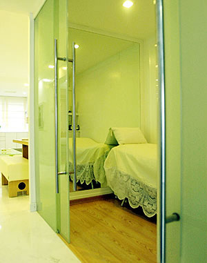 玻璃墻飾也是近來設(shè)計師喜歡用的裝飾手法,一來可以拉大房子的空間感,二來富于變化,常常給人驚喜。葉教授認(rèn)為,玻璃墻飾可以接受,但是有一個原則是不宜對床。此外,玻璃墻飾必須得靠實墻而置,不會令空間虛實不明。葉教授最后說,總之,家居中的玻璃裝飾不宜過多,具體如何運用,不同的房間結(jié)構(gòu)則有不同的說法。