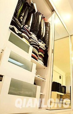 木板要省錢也可以從壁板動(dòng)腦筋。柜子釘壁板除了有防潮的功能外,還有受重的考量。若壁面沒有滲水的問題,沒有放置重物,可以不要釘柜子的壁板。像主臥這面展示柜,主要是要讓屋主放置個(gè)人收藏品及化妝品,所以設(shè)計(jì)師并沒有釘上壁板,這樣既省錢又有美感。
