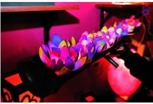 今年,紙燈造型更加多種多樣了,除了傳統(tǒng)方形、柱形、圓形,還有橄欖形、花形、貝殼形等。由于材料是紙,所以這類圖案很豐富,有用毛筆勾勒出的梅、蘭、竹、菊,傳統(tǒng)意味十足;有的燈利用了紙漿原有的抽象花紋,顯得很另類;還有種樹葉燈是樺樹葉和樺樹皮制成,薄得可見樹葉紋理;還有的直接把干花壓入紙中,當開燈時,干花在紙上若隱若現(xiàn)的,意境很美。