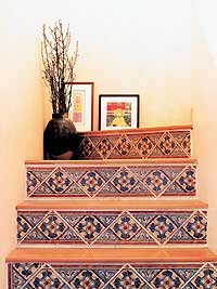 拱形與淡白的色調(diào)是地中海風(fēng)格的突出形象。這個樓梯是突出地中海風(fēng)格的一個亮點(diǎn),做法是扶手用磚徹,再用水泥沙漿披一層,最后刷上淡黃色的防水涂料。踏步采用與實(shí)木地板一樣的材料,下面裝飾菱形圖案的瓷磚。