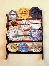 把家中累積的青色細(xì)瓷盤放在木架上作為墻飾。