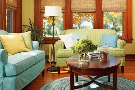 重新更換花朵圖案的沙發(fā)套時,如果你兩種圖案都喜歡,可以兩種都要。兩種顏色和圖案相近的沙發(fā)套可以和諧地擺放在一起,藍色和綠色使房間生動起來。