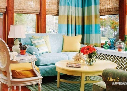 客廳的改造徹底完工了,而房間真的看起來更加溫暖明亮。原來蒼白的色調被充滿春日活力的明亮色彩所代替。新的色彩、圖案、布藝品完美地搭配起來,使這個客廳更加舒適、特別。漂亮的裝飾品也使房間更加閃亮。