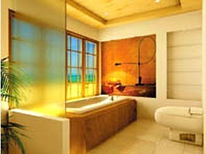 答:這個衛(wèi)浴間是改建后加大的。因為面積夠大,我在里面做了很多新概念的東西:有電視機,有綠化,還有休息的沙發(fā)。雖然都是很昂貴的潔具,但我把座便器盡量地藏進角落,而把比較藝術(shù)化的臺盆等用具做了著重的設(shè)計展示。其實高檔的衛(wèi)浴間里,干濕分明,潮氣不會很大,所以在休息區(qū)的一面墻還用了墻紙。