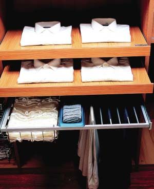 分格抽屜:絲質(zhì)的睡衣是最不容易碼放整齊的,而且女性的內(nèi)衣都怕擠壓,專設(shè)的內(nèi)衣抽屜平放衣物,可以很好地解決這個(gè)問題。