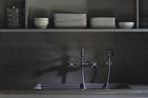 在廚房臺(tái)面與關(guān)鍵十分重要。這個(gè)廚房中石灰石臺(tái)面與暗色調(diào)的灰色墻面相搭配很好的襯托出了銀色龍頭的皎潔之美。而乳白色實(shí)木柜體的運(yùn)用讓陰暗色調(diào)略顯沉重的空間多了明快的觀感