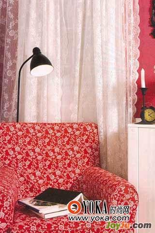 2.選擇室內(nèi)主色調(diào)的對(duì)比色作為窗簾用色,可以起到平衡整體色彩的作用。此例的起居室墻面漆成桃紅色,再加上大紅色碎花沙發(fā),整體色調(diào)較為艷麗,如果再用同色系窗簾,會(huì)讓視覺(jué)負(fù)荷過(guò)重,用白色通花窗簾則剛剛好,同色羅馬窗簾補(bǔ)充鏤花窗簾在遮光功能上的不足。