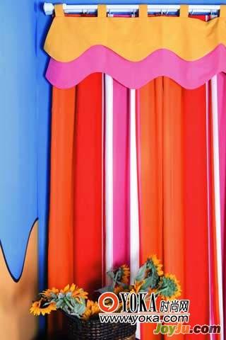4.用簾眉遮擋簾軌或窗簾頂部懸掛部分,可讓窗簾顯得更整潔大方。游戲室角落的窗簾,用檸檬黃和玫紅色兩層波浪形簾眉修飾窗簾頂部,不僅讓窗簾整體更顯整潔,也讓原本中規(guī)中矩的條紋窗簾生動(dòng)起來(lái)。