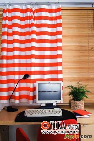 3.不同材質(zhì)組合運(yùn)用,不僅讓窗簾的形式更加豐富,也能更大程度發(fā)揮窗簾功效。書房的采光很重要,百葉簾便于調(diào)節(jié)書房?jī)?nèi)光線的強(qiáng)弱,但容易顯得單調(diào),加上橙紅色條紋垂簾,讓墻上的色彩更加活躍。