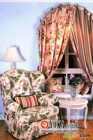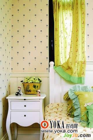 5.設(shè)計(jì)窗簾時(shí)要注意因勢(shì)利導(dǎo)、因人而異,根據(jù)窗戶的特點(diǎn)和使用者的性格特征來(lái)設(shè)計(jì)。此間兒童房的窗簾采用分體式設(shè)計(jì)。上半部圓弧形部分是用棉布做出自然褶度的異型窗簾,以魔術(shù)貼固定在窗框上,拆卸清洗均十分方便;下半部則是用彩色條紋棉布制成的卷簾,在卷簾下部開了個(gè)高叉,兩邊則配以紐扣和紐孔。這樣,即使卷簾放下的時(shí)候,也能很方便地把卷簾一角掀開,以紐扣在相應(yīng)部分固定好,以獲取光線,符合兒童的需要。
