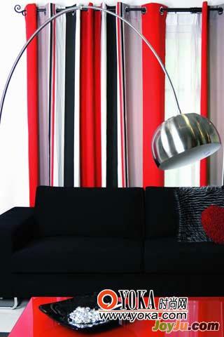 9.窗簾的色彩可以跟室內(nèi)大型家具的色彩一致,也可以取若干種主要家具的色彩之和??蛷d內(nèi)的組合沙發(fā)是黑色的,茶幾則是紅色的,而靠墊、果盤等小配飾也采用黑色跟紅色兩種主題色,因此,窗簾選用黑紅色條紋帆布質(zhì)地,強(qiáng)調(diào)室內(nèi)色彩主題,也將空間內(nèi)所有色彩元素統(tǒng)一起來(lái),和諧度因此大大增強(qiáng)。