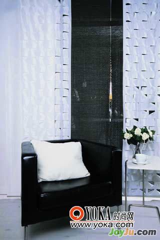 12.不同類型的裝飾簾組合運(yùn)用,更有裝飾效果。此處為客廳跟陽(yáng)臺(tái)過(guò)渡的部分,因?yàn)殛?yáng)臺(tái)上另有窗簾,所以在遮光性上要求不高,只要能遮擋視線就可以。因此,采用兩層裝飾簾組合運(yùn)用的設(shè)計(jì)方案。黑色裝飾簾為基礎(chǔ)色,跟沙發(fā)色彩協(xié)調(diào)一致,鏤空白色簾則為加層,提升裝飾性,同時(shí)也跟邊桌色彩呼應(yīng)。