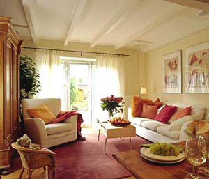 設(shè)計師在這個客廳的設(shè)計上,刻意追求音樂中的韻律。櫻桃木的實木地板和淺黃色的內(nèi)墻乳膠漆顯得沉穩(wěn)、大度,是整個客廳的“基調(diào)”;而通向陽臺的“啞口”上方的裝飾以及天花板上的假梁和燈具,則是“客廳樂章”的“華彩樂段”。客廳入口的裝飾性書架和陽臺旁的展示架,則是整個樂章的開頭和結(jié)尾。