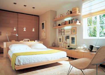 在擺放床的地域處,裝修出10公分左右高的木質(zhì)“地臺(tái)”,相應(yīng)地選用較低矮的床。其效果是:使睡眠區(qū)的環(huán)境更為清潔;地臺(tái)烘托中的床與人更有一種“精品”的藝術(shù)美感;假如采用花梨木質(zhì)的地臺(tái)還可給人以芬芳的氣息。