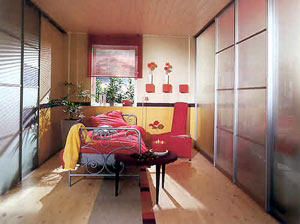 臥室里沿用了一些客廳的色彩和收納方法,留出了較大的臥室空間,避免了擁擠的感覺,便于營(yíng)造靜謐的氣氛。高達(dá)天花板的書架和窗下設(shè)置的矮柜讓主人的收藏得到充分的收納和展示。床頭處安排了一面帶有隔板的背景墻,讓臥室和客廳的氣質(zhì)按照主人的喜好形成絕對(duì)的統(tǒng)一。床對(duì)面設(shè)有高達(dá)天花板的衣柜,可以把衣物和床上用品全部收納進(jìn)去,在衣柜靠窗的一側(cè)還有一個(gè)大型的書架,用來擺放書籍和CD,生活里的精神享受得到了極大的重視。