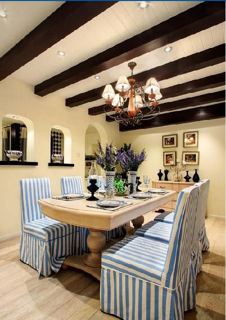 概要: 濃郁地中海特色淺淺的具有不同質感與色相的白與藍色條紋,在家具、墻面、頂棚、梁柱等各個層面化解延伸,使整個居室充滿了視覺的清新感,呈現(xiàn)質樸、唯美、慵懶的空間氣質。鐵藝的立式座鐘整個空間唯美浪漫?! ?*厚實的木質家具,蘭白相間的條紋布藝,優(yōu)美的吊頂弧線、典雅的吊燈似乎都在演繹著浪漫。獨特的設計讓空間得以擴展與延伸,格調更具浪漫情懷。