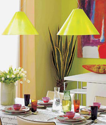 餐桌上綠色的吊燈與綠色的墻壁相呼應(yīng),不會讓白色餐廳在整個房間中顯得突兀。餐桌上一塊英文手寫體圖案的桌布避免了白色餐桌的單調(diào),餐具上繽紛的顏色將房間的整體風(fēng)格縮小到杯盤之間,成為餐桌上的點(diǎn)睛之筆。白色花瓶里的白色鮮花讓用餐氣氛更溫馨。