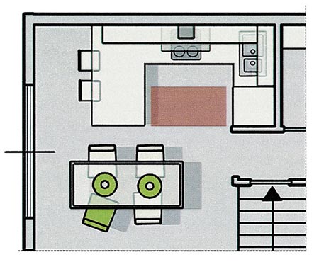 餐廚空間與起居室相連,所以在顏色的使用上要與之保持連貫,但開放的空間需要安排一些起伏,讓起居室和餐廚空間的分區(qū)更加明確,也可以給絢麗的環(huán)境增加一些緩沖,讓起居室的亮麗更突出,讓餐廚空間的生活氣息更濃。