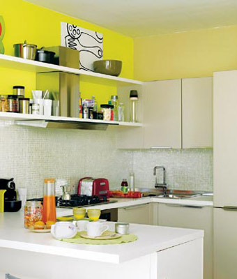 概要: 亮麗的色塊+白色家具 清新宜人的餐廚空間 餐廚空間與起居室相連,所以在顏色的使用上要與之保持連貫,但開放的空間需要安排一些起伏,讓起居室和餐廚空間的分區(qū)更加明確,也可以給絢麗的環(huán)境增加一些緩沖,讓起居室的亮麗更突出,讓餐廚空間的生活氣息更濃?! ⊙永m(xù)墻壁的顏色,開辟另一個空間 開放式餐廚空間的主色為綠色,延續(xù)了起居室墻壁的顏色。