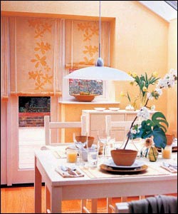 墻面粘貼了大面積的淡黃色壁紙,房間有了色彩。但僅僅如此是不夠的,假如在門窗上加上十分搭配的布簾,效果會(huì)更好。這里用印有簡(jiǎn)單花朵的淡黃色壁布做成簡(jiǎn)練的幾道卷簾。雖然餐廳里的家具都很簡(jiǎn)單,但挑選風(fēng)格諧調(diào)的壁紙、壁布相互搭配,餐廳開始變得有情致。