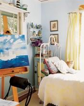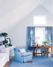 最適合于夏日午后時光流連的舒適小床,簡潔的鐵藝床頭富于美感,手感厚實暖和的白色床罩和窗簾,搭配淺藍色的墻壁和家具,氣氛寧靜。大小不同的靠墊有很好的裝飾效果。