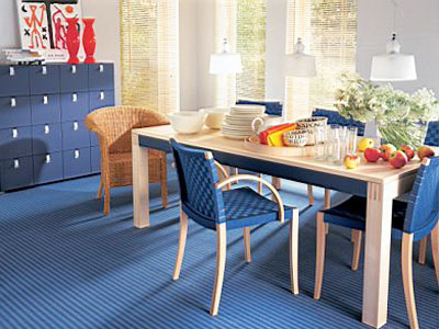 餐廳看起來很整潔,采用了藍色和白色為主,看起來很舒服。墻壁上做了藍色的柜子很實用,它就像是個百寶箱可以使餐廳變得很干凈。為了擺脫單調(diào)感,擺放了色彩較強的紅色裝飾品。白色的吊燈突顯了餐廳的別致感,色彩整體搭配得非常漂亮。