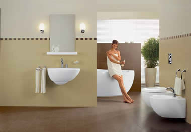 浴室中最理想的色調(diào)是粉色系,例如:粉紅、淡綠、淡藍(lán)及桃紅色等。其次則是奶油色系,或是一些中性色,如:黑色及白色。裝飾物及毛巾等配件則可選擇強烈的對比色系。