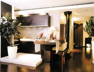 2.廚房就在客廳旁,用一個頗有個性和意境的屏風(fēng)分隔,既節(jié)省了空間,又調(diào)動出整個房子的味道。