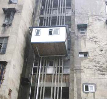 被稱為“史上最牛的廚房”懸身于青山116街坊22棟7單元5樓外墻上。27日下午2時(shí)許,記者在樓下看到,該廚房依靠兩根斜拉的三角鋼焊接在五樓頂窗桿上,廚房是用活動(dòng)板和鐵皮做的,長約3米,寬約2米,高約2米。閣樓外墻上開有兩扇小窗,其中一扇有抽油煙機(jī)排氣管。該樓有7層,僅5樓外墻建了廚房。遠(yuǎn)遠(yuǎn)看去,在平整的樓房外墻映襯下,顯得格外突出。