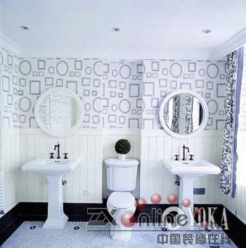 那是個(gè)抽水馬桶嗎?它難道不更像一個(gè)寶座嗎?不但馬桶本身居于嚴(yán)格對(duì)稱的布局正中,就連唯一的植物都在強(qiáng)調(diào)著這個(gè)抽水馬桶的不可一世??瓷先?,這個(gè)衛(wèi)浴間更像是以這個(gè)馬桶為中心設(shè)計(jì)的。在馬桶周圍不僅強(qiáng)調(diào)格局的對(duì)稱,而且到處都是圓形和方塊。這兩種圖案鋪滿了墻壁,就連鏡子和盥洗池都是。再加上整齊排列的頂燈和墻圍上的大量的直線條,這個(gè)衛(wèi)浴間的主人是個(gè)有點(diǎn)自我中心的人,他重視自己的地位和權(quán)威,嚴(yán)謹(jǐn)而不散漫。