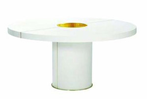 圓形桌面,圓柱形桌腿,雖然造型稱不上令人過目難忘,但純凈的白色還是會讓人感到單純的可愛。桌面中央的中空軸內(nèi)壁用金光熠熠的馬賽克進行了裝飾,這種不顯山、不露水的低調(diào)華貴絕對是整個茶幾最讓人感到驚艷的地方。