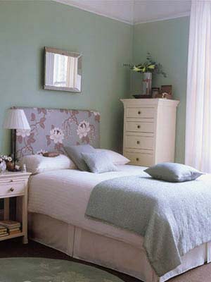 灰色地毯與綠色依然和諧共存,搭配得體。大花紋樣式的淺藍(lán)灰色床頭飾板為房間的靜帶來難得的動(dòng)感。白色的床單、枕頭和淺灰藍(lán)色的靠墊、毯子是綠色的延續(xù),很好的回應(yīng)了主題。