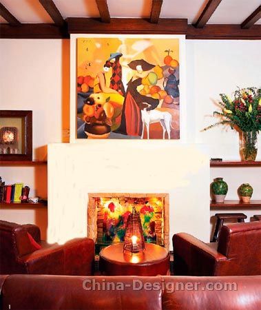 起居室里,一輪故意做舊的棗色皮質(zhì)沙發(fā)圍出了視聽區(qū)域,電視機(jī)背后鮮艷的大色塊裝飾畫、小巧剔透的水晶墻面立燈和印花編織地毯交相輝映,循序漸進(jìn)地豐富著色彩。皮沙發(fā)的背后是客廳的另一側(cè),廢棄的壁爐被主人精心打造成一件裝置藝術(shù),底部由馬賽克鋪出一個小小的池塘,篝火處安置著一件形似火焰的琉璃雕塑,通透斑斕的色彩倒印在池塘水中呈現(xiàn)出水火交融的意境,可算是客廳里最高調(diào)的裝飾了。兩個單人沙發(fā)圍在壁爐前,中間放著同系列的皮質(zhì)茶幾,由一個竹簽編制成燈罩的小臺燈點(diǎn)綴。從背后望去,這樣的組合像極了老電影中的道具,仿佛時光交錯,浮現(xiàn)出泛黃的景象:一家人圍坐在篝火前翻著老相冊念著老故事,咖啡香飄,溫情滿溢。