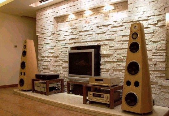 紋理粗糙的文化石造型可以凸現(xiàn)整個家裝的精致感覺。從功能上說,文化石可以吸音,避免音響對其他居室的影響,從裝飾效果上看,它烘托出電器產(chǎn)品金屬的效果。