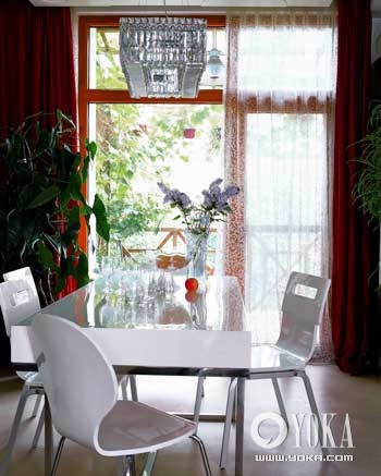 臨窗放置的白色鏡面餐桌簡潔圓潤,有著考究的細節(jié),凸顯時尚感。