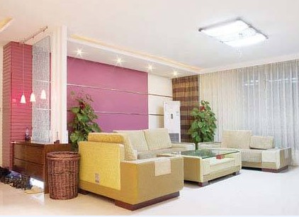 紫色背景墻最常用的地方是沙發(fā)背景墻。用紫色壁紙大面積鋪帖,只在柜式空調(diào)的后面留出相應(yīng)的白色部分,再用銀色金屬條橫著粘貼在壁紙上,既能保證整體色調(diào)的完整,又不會(huì)死板,而且銀色也是一種很高檔的顏色,整體看來(lái)很有品位。值得注意的是家具一定要選擇淺色的,不然客廳就會(huì)顯得很暗。