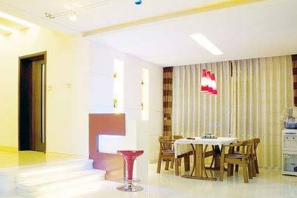 解決了玄關(guān)的問(wèn)題,再看餐廳。因?yàn)橹魃顓^(qū)比餐廳地面高,需要設(shè)計(jì)一個(gè)小臺(tái)階。如果臺(tái)階孤零零地放在餐廳與客廳之間顯得很礙眼,而緊挨著它在餐廳一側(cè)設(shè)計(jì)一個(gè)只有半墻高的小吧臺(tái)問(wèn)題就解決了。放一把紫色的吧臺(tái)椅在那里,又一個(gè)休閑區(qū)就形成了。